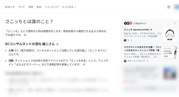 「AI モード」で「さこっちとは誰のこと?」「さこっちって?」と聞いてみると、最上位に「代表的な人物としては、SEOコンサルタントの『酒匂雄二』さんがあげられます」のように生成されることが多いです。