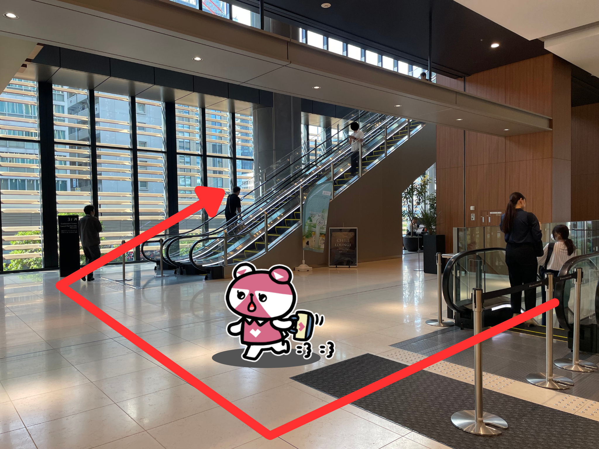直進すると、エスカレーターが見えてきます。現在地は地下1階(B1F)で、このエスカレーターで2階のオフィスロビーまで上がります。