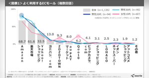 - よく利用するECモールの1位は「Amazon」で68%、2位は「楽天市場」で61%、3位は「Yahoo!ショッピング」で32%、「ヨドバシ」が13% 2025/10/29
