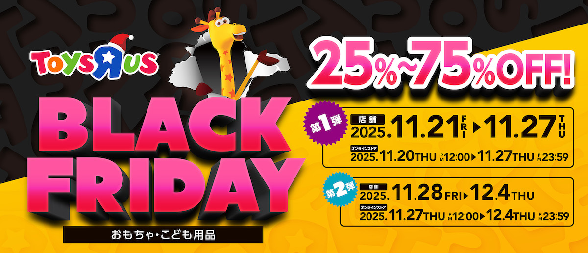 玩具やベビー用品の総合専門店を運営する日本トイザらスは11月20日から、全国の「トイザらス」「ベビーザらス」の実店舗、オンラインストアで、おもちゃ・子ども用品を対象とした「ブラックフライデー」セールを実施する。実店舗では11月21日の開店時間から、オンラインストアは11月20日12時から、対象商品を大幅割引価格で販売する。
